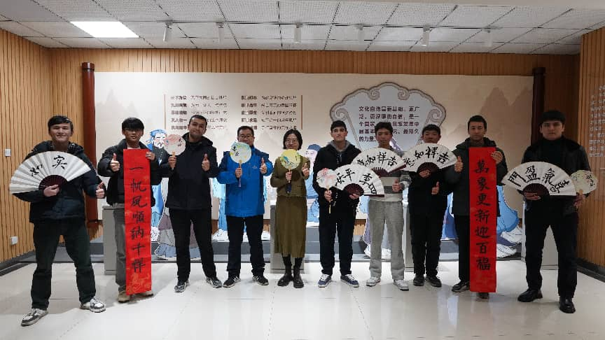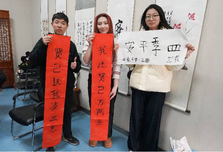 创作过程中,文化交流的火花自然迸发。来自乌兹别克斯坦的阿迪克感叹,“这像一场与材料的对话,需要耐心和感悟,让我理解了东方艺术中‘顺应自然’的智慧。”在书法体验区,塔吉克斯坦学生杨网握起毛笔,在文学社同学的指导下,认真地写下“和谐”与“友谊”等汉字。她表示,每一笔画都承载着力量与祝福,书写的过程也是对中国“和合”文化的切身领悟。活动现场,大家围绕作品畅谈各自民族对色彩、图案与美的理解,在协作中深化友谊,在交流中拓宽视野。